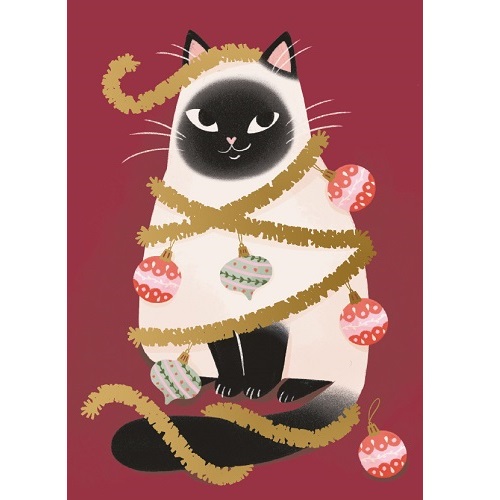Kotimainen 1-osainen joulukortti laadukasta kartonkia. Kuvassa kissa joka on sotkeutunut joulukoristeisiin. Tummanpunainen tausta, ei tekstiä. Kultafolioidut yksityiskohdat. Koko 105 x 148 mm. Design: Kaisu Sandberg.