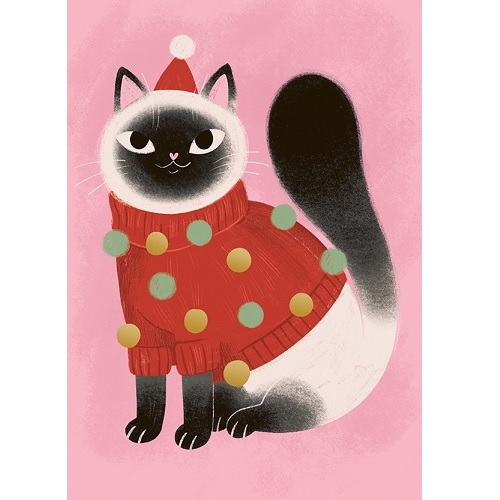 Kotimainen 1-osainen joulukortti laadukasta kartonkia. Kortin kuvassa kissa jolla punainen villapaita ja tonttulakki, sekä vaaleanpunainen tausta. Kortissa on kultafolioidut yksityiskohdat ja se on tekstitön kääntöpuolelta. Koko 105 x 148 mm. Design: Kaisu Sandberg.