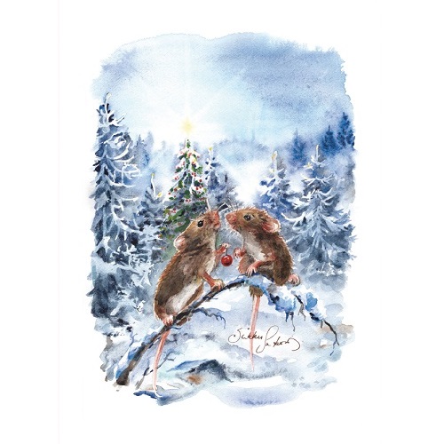 Kotimainen 1-osainen joulukortti laadukasta kartonkia. Kuvassa kaksi hiirtä istumassa oksalla, ihana talvimaisema ja joulukuusi taustalla. Ei tekstiä. Koko: 105 x 148 mm. Design: Sirkku Saukonoja.