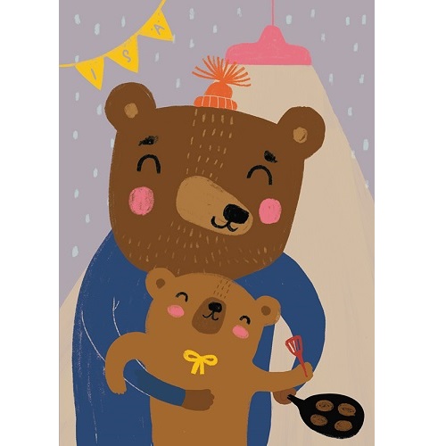 Kotimainen 2-osainen isänpäiväkortti laadukasta kartonkia. Kannessa isäkarhu ja lapsikarhu paistamassa lettuja, taustalla keltainen viiri jossa teksti ”Isä”. Kortti on sisältä tyhjä, ja sisältää kirjekuoren. Koko 105 x 148mm. Design: Mira Mallius.