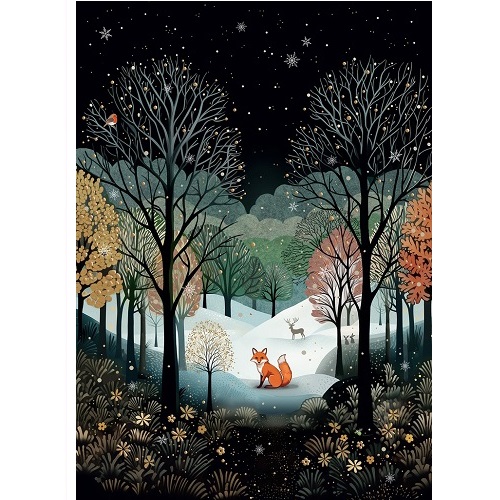 2-osainen joulukortti laadukasta kartonkia. Kuvassa on tummalla taustalla talvisessa metsässä kettu ja kauris. Kortissa on folioidut yksityiskohdat, se on sisältä tyhjä ja sisältää kullanvärisen kirjekuoren. Koko 167 x 118 mm. Design: Bug Art.
