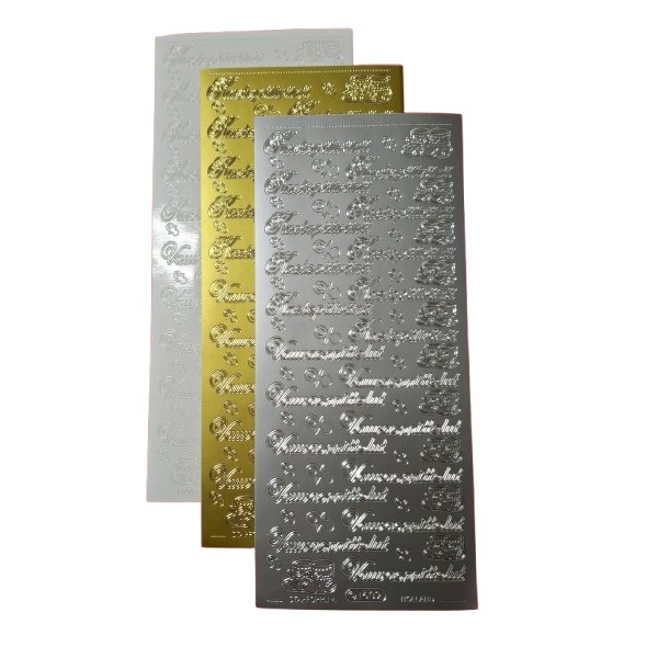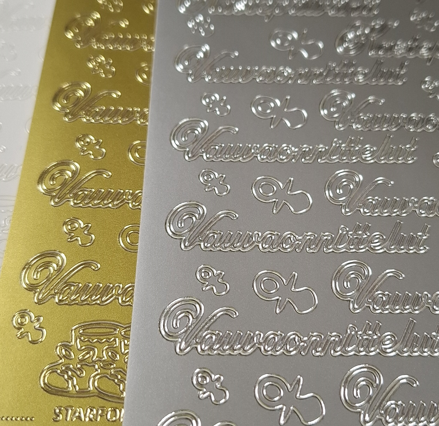 Ääriviivatarrateksti vauvakortteihin. Arkissa tekstit Kastepäivänä ja Vauvaonnittelut sekä vauvan töppösiä ja tutteja.