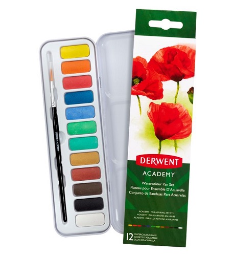 Academy Watercolour-lajitelma sisältää 12 vesivärinappia, sävyt: Acid Yellow, Orange, Red, Dark Blue, Blue, Dark Green, Light Green, Yellow Ochre, Terracotta, Burnt Umber, Black ja White. Metallirasiassa myös sivellin sekä 3 koloa värien sekoitusta varten.