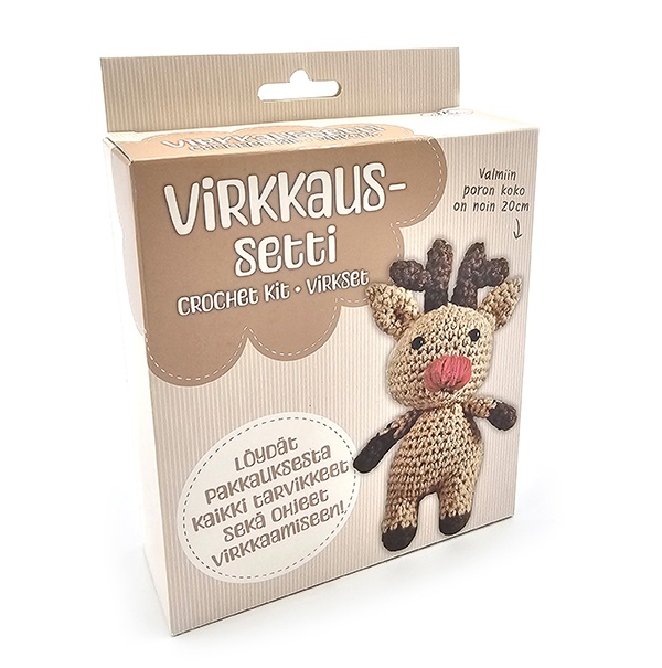 DIY-Virkkaussetti askarteluun ja käsitöihin. Itse tehty lahja läheiselle tai koristeeksi kotiin! Pakkaus sisältää kaiken tarvittavan yhden poron virkkaamiseen. Pakkaukseen kuuluu kolme eri väristä lankaa (ruskea, tummanruskea, punainen), vanua, virkkuukoukku, kaksi turvasilmää, neula ja suomenkieliset ohjeet. Huom! Tuotetta ei ole testattu turvallisuusstandardien mukaisesti ja se on ensisijaisesti tarkoitettu askartelukäyttöön.