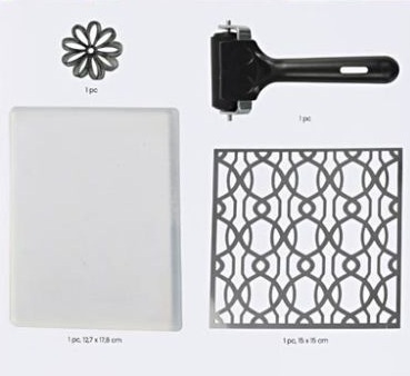 Sisältö: Geelilevy, sabloneita, leimasin ja tela. Ei sisällä maaleja, papereita tms.