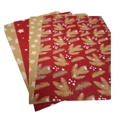 Jouluiset kuviopaperit korttiaskarteluun. 4 eri kuosia. Yhteensä 20 arkkia. Papereissa glitteriä.