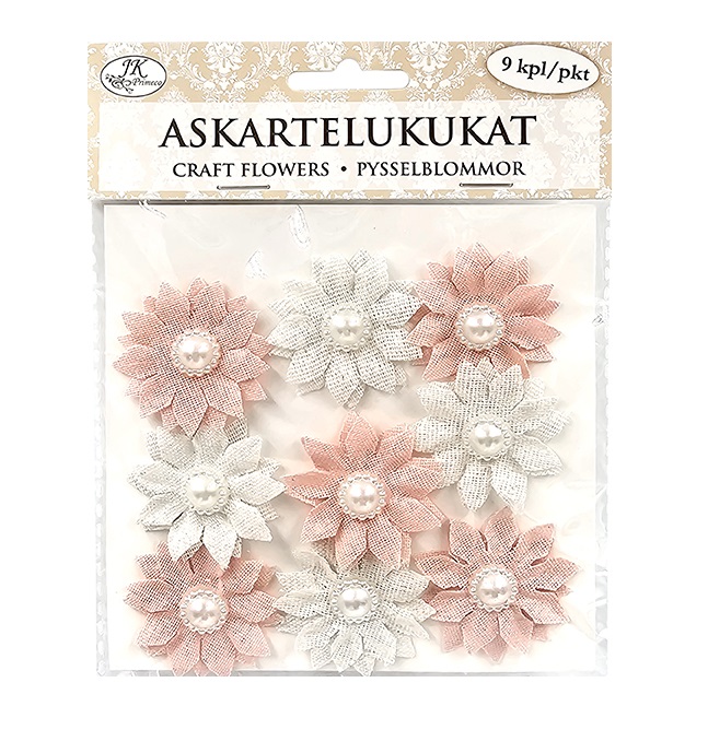 Askartelukukat askarteluun ja koristeluun. Pakkaus sisältää yhdeksän kappaletta kankaisia kukkia kolmessa eri värissä. Kukissa on muovinen koristehelmi keskellä.