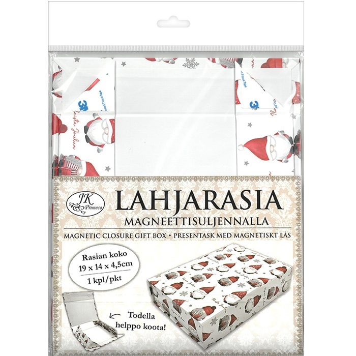 Vahvalaatuinen lahjarasia paketointiin. Erittäin helppo koota! Taita rasia valmiiden taitosten mukaan ja kiinnitä kulmat kaksipuoleisella teipillä (valmiina rasiassa). Täytä haluamillasi pienillä lahjoilla ja sulje magneettisuljennalla. Lahjarasia on valmis ja tyylikäs lahjapakkaus eikä vaadi välttämättä muita koristeita. Vahvalaatuisen materiaalin vuoksi lahjarasia säilyy laadukkaana pitkään ja sitä voi käyttää uudelleen myös säilytysrasiana. Pakkaus sisältää yhden kartonkisen rasian, jonka kannessa on magneettisuljenta.