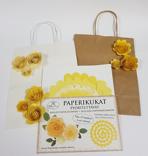 Valmiista pakkauksesta tulee 27 kukkaa, 3 eri kokoa/3 eri väriä. Valmiiden kukkien halkaisijat 2,5cm, 3,75cm ja 5cm. Paperilehdet myydään erikseen, tuotenumero JK4945.