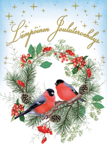 Sama kaunis väriteema jatkuu kortin sisäpuolellakin. Sisäaukeamalla teksti Hyvää Joulua ja Onnellista Uutta Vuotta. Kortin mukana tulee myös valkea kirjekuori.