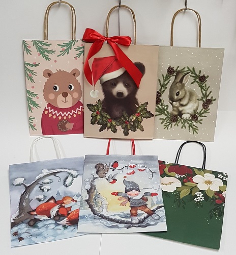Myymälässä lahjakassit yksittäin myynnissä joulusesongin aikaan.