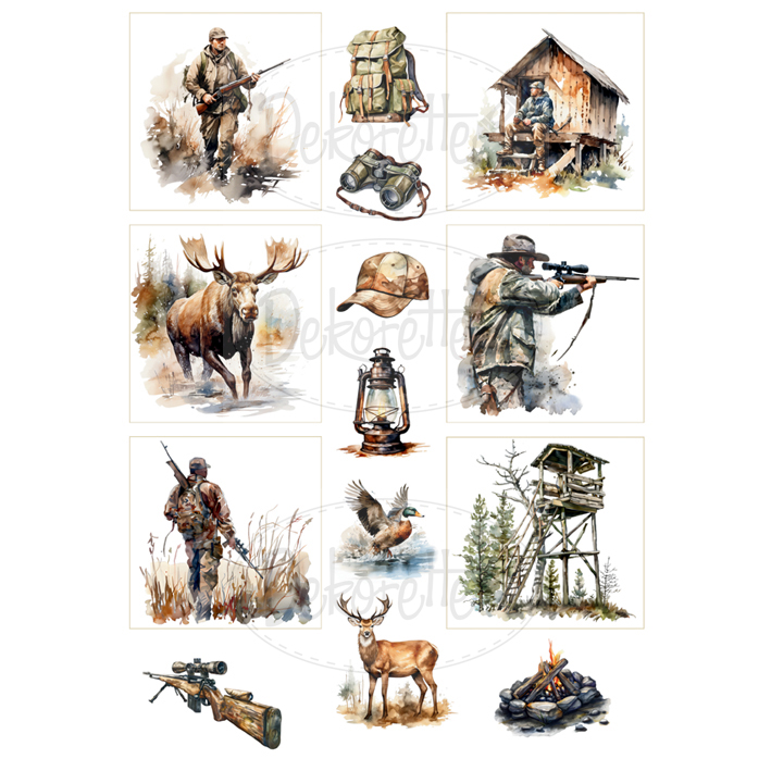 Metsästysaiheinen kuva-arkki  korttiaskarteluun esim.isänpäiväkortteihin ja miesten kortteihin. Arkin koko A4, kartonkia 250g. Arkit painettu Suomessa.
