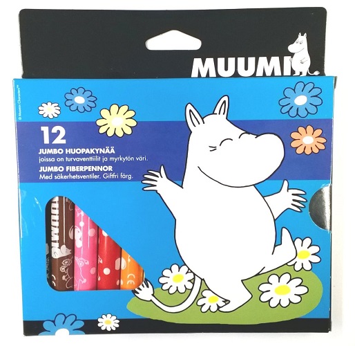 12 kappaletta erivärisiä hyvälaatuisia ja turvallisia Muumi-huopakyniä jumbo-koossa. Myrkytön väri ja kestävä kärki.
