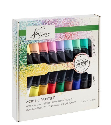 Nassau akryylimaalisetti 18 väriä x 36ml pastelli- ja perusvärit1 varastossa