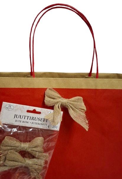 Lisäkuvissa ideoita rusetiksi. Esim. valmis JK Primecon juuttirusetti tai tee itse askarteluniinestä. Myös paperinarusta ja paperinauhasta saa kauniit rusetit.