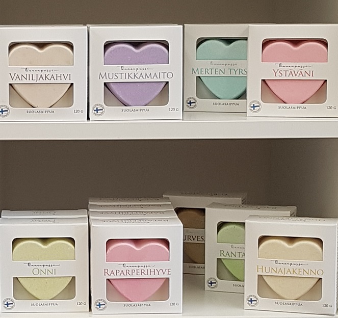 Kotimaiset, vegaaniset (ei hunajakenno), säilöntäaineettomat hoitavat saippuat.