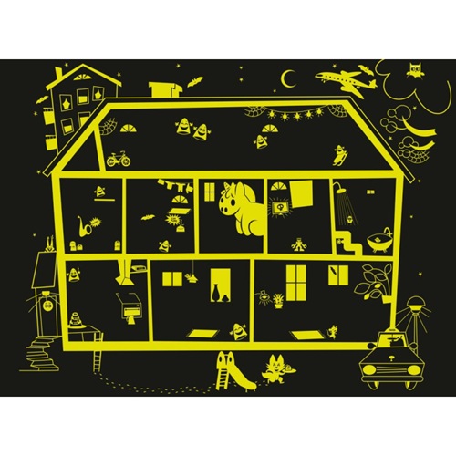 Valloittava 100 palan palapeli täynnä tutkittavaa ja etsittävää! Eläinperheiden talo on täynnä hullunkurisia tilanteita. Miksi katosta pölisee laastia? Kenen vessassa törisee? Kuka on haukannut herkkukakusta? Palapelin sivuista löytyy hauskoja etsimistehtäviä. Kuinka monta k-kirjaimella alkavaa asiaa löydät talosta? Entä montako hammasharjaa löydät kuvasta? Kun palapeli on valmis, sammuta valot ja katso, mitä uneton asukki puuhaa talossa yölliseen aikaan – palapelin yksityiskohdat hohtavat pimeässä! Palapelin kokoaminen, kuvien tutkiminen ja kysymyksiin vastaaminen kehittävät lapsen kuvanlukutaitoa, sanavarastoa ja hahmotuskykyä.