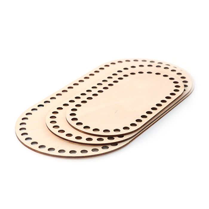 Käsittelemättömästä 3 mm puuvanerista laserleikattu korinpohja, reikien läpimitta 8mm.