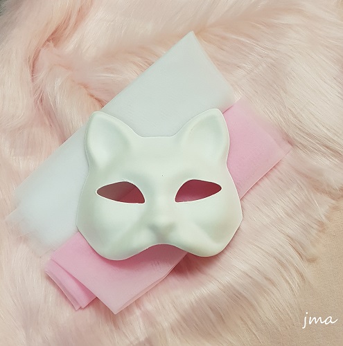 Tuotekuvassa kissamaskin alla keskellä olevat pieneksi rullatut verkkomaiset läpinäkyvät kankaat. Tarkempi tuotekuva myöhemmin. Karvakankaat ja kissanaamarit myydään erikseen.