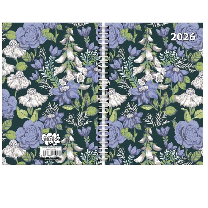 Sisältää vuosisuunnitelman, liputuspäivät, suomenkieliset nimipäivät, tehtävälistoja ja runsaasti muistiinpanotilaa, sekä viivoilla että ruuduilla.